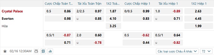 Tip kèo Châu Á full trận Crystal Palace vs Everton