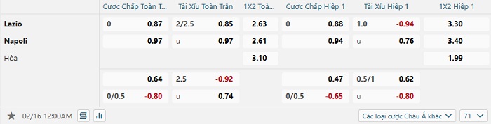 Tip kèo Châu Á full trận Lazio vs Napoli