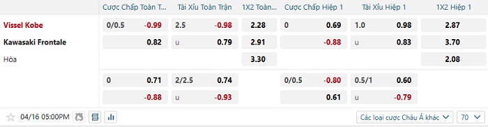 Tip kèo Châu Á hiệp 1 Vissel Kobe vs Kawasaki Frontale