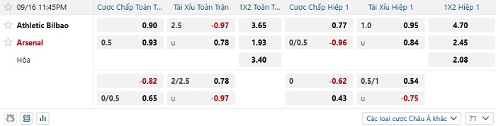 Tip kèo Châu Á full trận Bilbao vs Arsenal