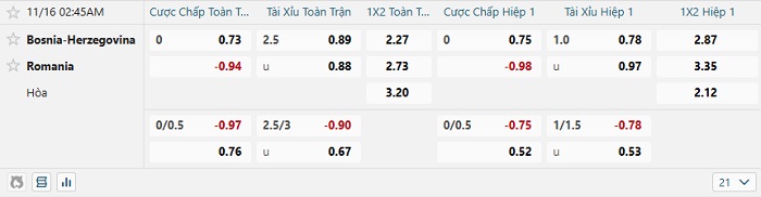 Tip kèo Châu Á full trận Bosnia vs Romania