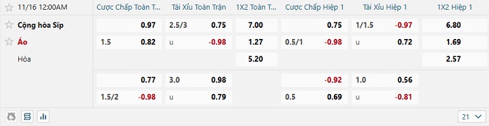 Tip kèo Châu Á hiệp 1 Síp vs Áo