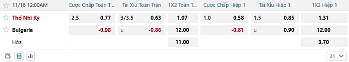 - Dự đoán tỷ số hiệp 1: Thổ Nhĩ Kỳ 1 – 0 Bulgaria