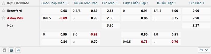 Tip kèo tỷ số Brentford vs Aston Villa