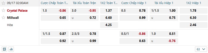 Tip kèo Châu Á hiệp 1 Crystal Palace vs Millwall