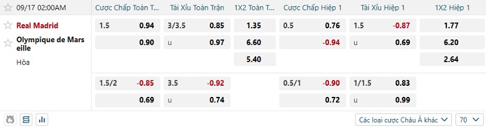 Tip kèo Châu Á hiệp 1 Real Madrid vs Marseille