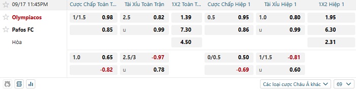 Tip kèo Châu Á hiệp 1 Olympiacos vs Pafos FC
