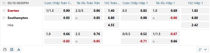 Tip kèo Châu Á full trận Everton vs Southampton