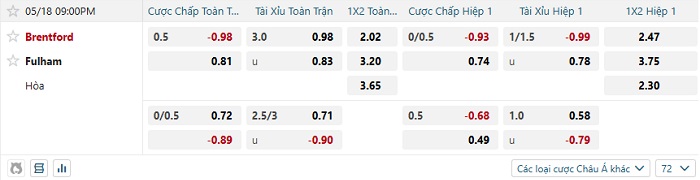 Tip kèo Châu Á full trận Brentford vs Fulham