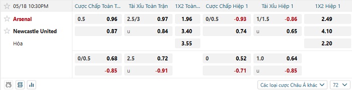 Tip kèo Châu Á full trận Arsenal vs Newcastle