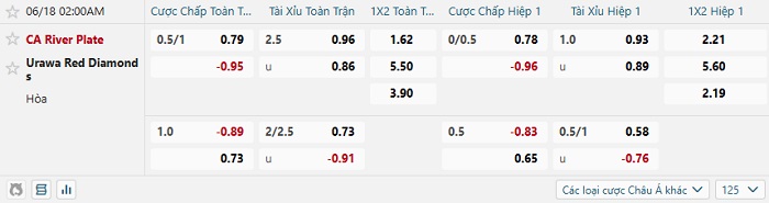 Tip kèo Châu Á full trận River Plate vs Urawa Red Diamond