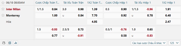 Tip kèo Châu Á full trận Inter Milan vs Monterrey