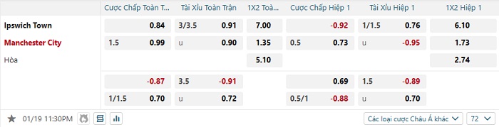 Tip kèo Châu Á hiệp 1 Ipswich vs Man City