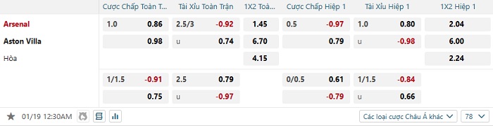 Tip kèo Châu Á hiệp 1 Arsenal vs Aston Villa