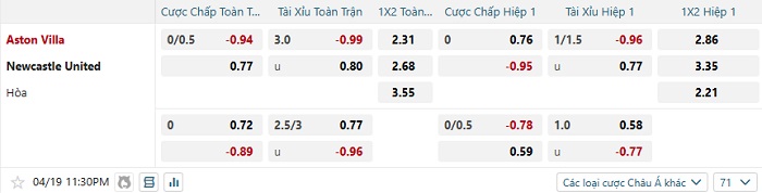 Tip kèo Châu Á hiệp 1 Aston Villa vs Newcastle