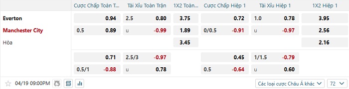 Tip kèo Châu Á hiệp 1 Everton vs Man City