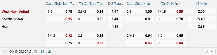 Tip kèo Châu Á hiệp 1 West Ham vs Southampton
