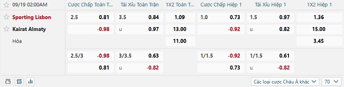 Tip kèo Châu Á hiệp 1 Sporting Lisbon vs Kairat Almaty