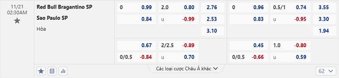 Tip kèo Châu Á full trận RB Bragantino vs Sao Paulo