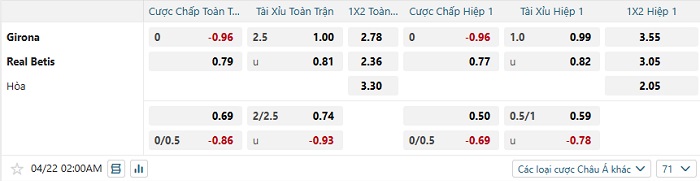 Tip kèo Châu Á full trận Girona vs Real Betis