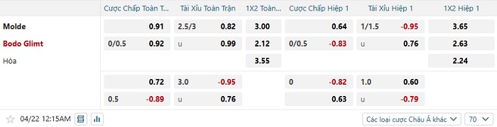 Tip kèo Châu Á hiệp 1 Molde vs Bodo Glimt