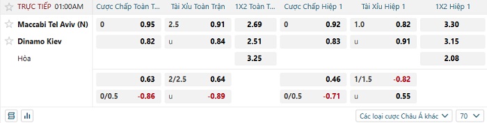 Tip kèo Châu Á hiệp 1 Tel Aviv vs Dinamo Kiev
