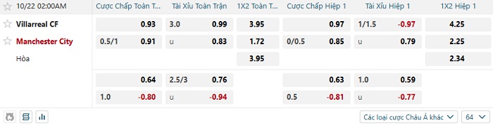 Tip kèo Châu Á full trận Villarreal vs Man City