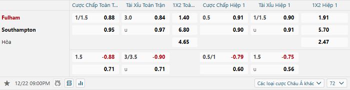 Tip kèo Châu Á full trận Fulham vs Southampton