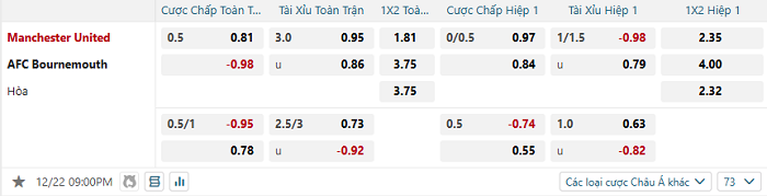 Tip kèo Châu Á hiệp 1 Man United vs Bournemouth