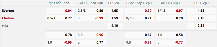 Tip kèo Châu Á hiệp 1 Everton vs Chelsea