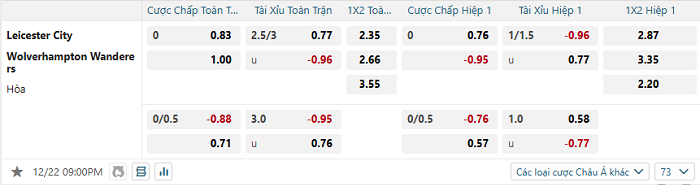 Tip kèo Châu Á hiệp 1 Leicester vs Wolves