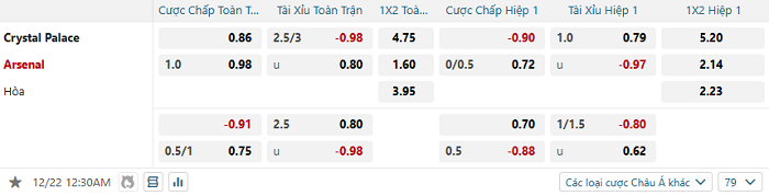 Tip kèo Châu Á full trận Crystal Palace vs Arsenal
