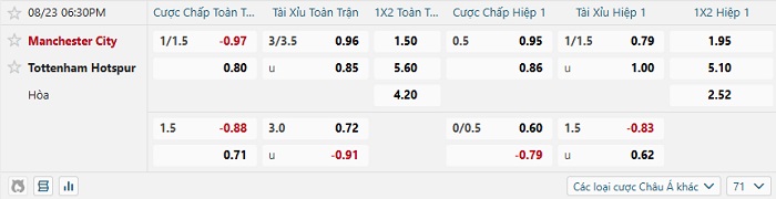 Tip kèo Châu Á full trận Man City vs Tottenham