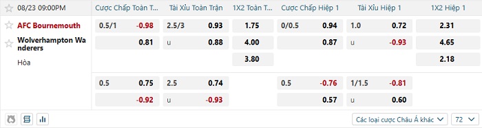 Tip kèo Châu Á full trận Bournemouth vs Wolves