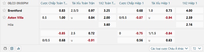 Tip kèo Châu Á hiệp 1 Brentford vs Aston Villa