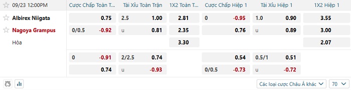 Tip kèo Châu Á hiệp 1 Albirex Niigata vs Nagoya Grampus