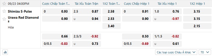 Tip kèo Châu Á hiệp 1 Shimizu S-Pulse vs Urawa Red
