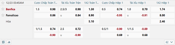 Tip kèo Châu Á hiệp 1 Benfica vs Famalicao