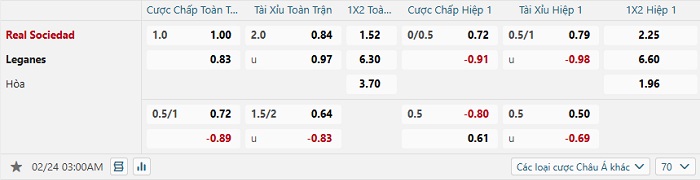 Tip kèo Châu Á full trận Real Sociedad vs Leganes