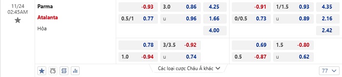 Tip kèo Châu Á full trận Parma vs Atalanta