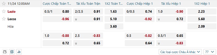 Tip kèo Châu Á hiệp 1 Lazio vs Lecce