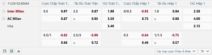 Tip kèo Châu Á full trận Inter vs AC Milan
