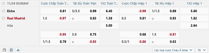Tip kèo Châu Á hiệp 1 Elche vs Real Madrid