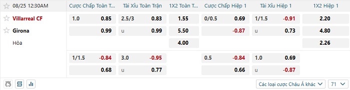 Tip kèo Châu Á hiệp 1 Villarreal vs Girona