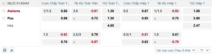 Tip kèo Châu Á hiệp 1 Atalanta vs Pisa