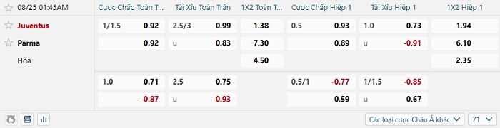 Tip kèo Châu Á hiệp 1 Juventus vs Parma