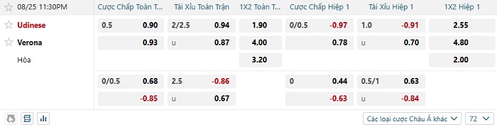 Tip kèo Châu Á hiệp 1 Udinese vs Verona