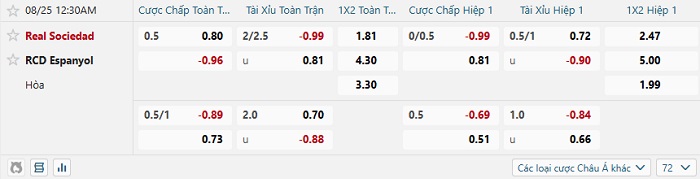 Tip kèo Châu Á hiệp 1 Real Sociedad vs Espanyol