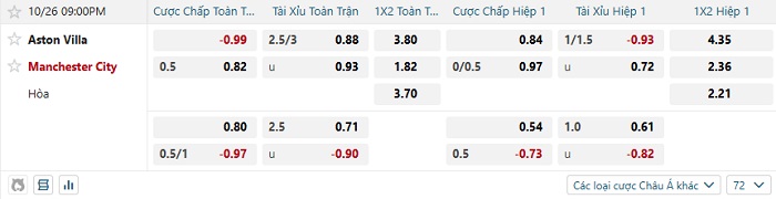 Tip kèo Châu Á full trận Aston Villa vs Man City