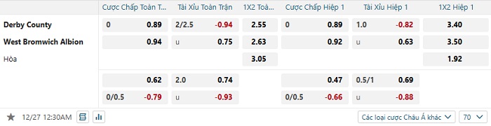 Tip kèo Châu Á hiệp 1 Derby County vs West Brom